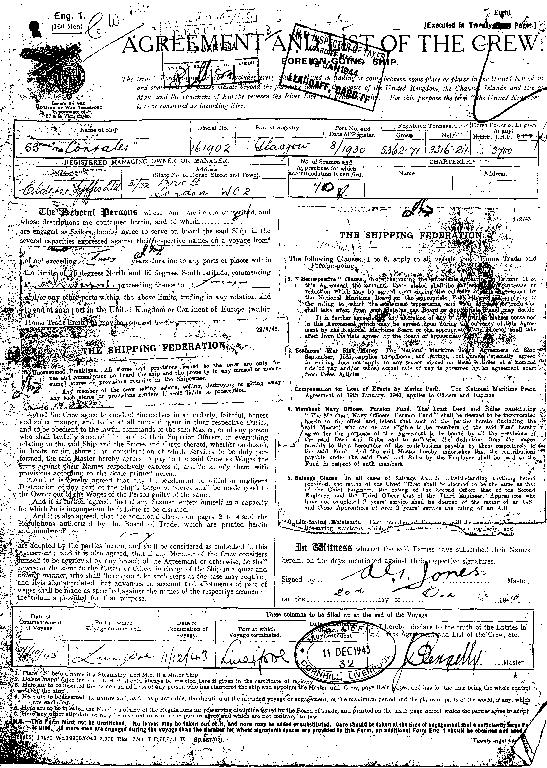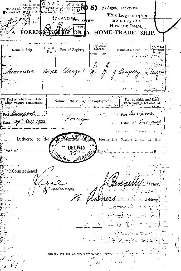 Here's some of the information that was sent to me:I would appreciate any assistance on tracking information related to a wartime voyage of the Merchant Ship *SS Corrales*. The things I have at this point in time are based on information given me by my Mother (a passenger) and some documentation by a newly found friend in Britian. (Thanks, Jeff!) The Vessel SS Corrales Official No. 161902 Owned by Elders & Fyffes Ltd. Port of Registry Glascow Date of Register(?) 8/1930 Registered Tonnage(gross) 5362 71 Registered Tonnage(net) 3316 24 Engine H.P. 3700 Specifics on the trip: Part of a convoy. (Convoy number unknown). Ships Master Jones (First initial A.??) Departed Liverpool 20 Oct. 1943 Arrived St. Johns 14 Nov. 1943 (on or about) Returned to Liverpool 11 Dec. 1943 What I've gotten so far: Crew List Some logs of the voyage What I'd like to get: - A picture of the SS Corrales. - The convoy number. - Any additional historical info. eg: I found SS Corrales referenced at a site which talked about the Nicoya. - Passenger list - I'd also like to find out if any of the crew are still alive (one in particular would now be 80 yrs old). - Any other information related to this transit Thanks in advance for any information or references.